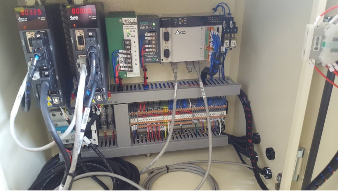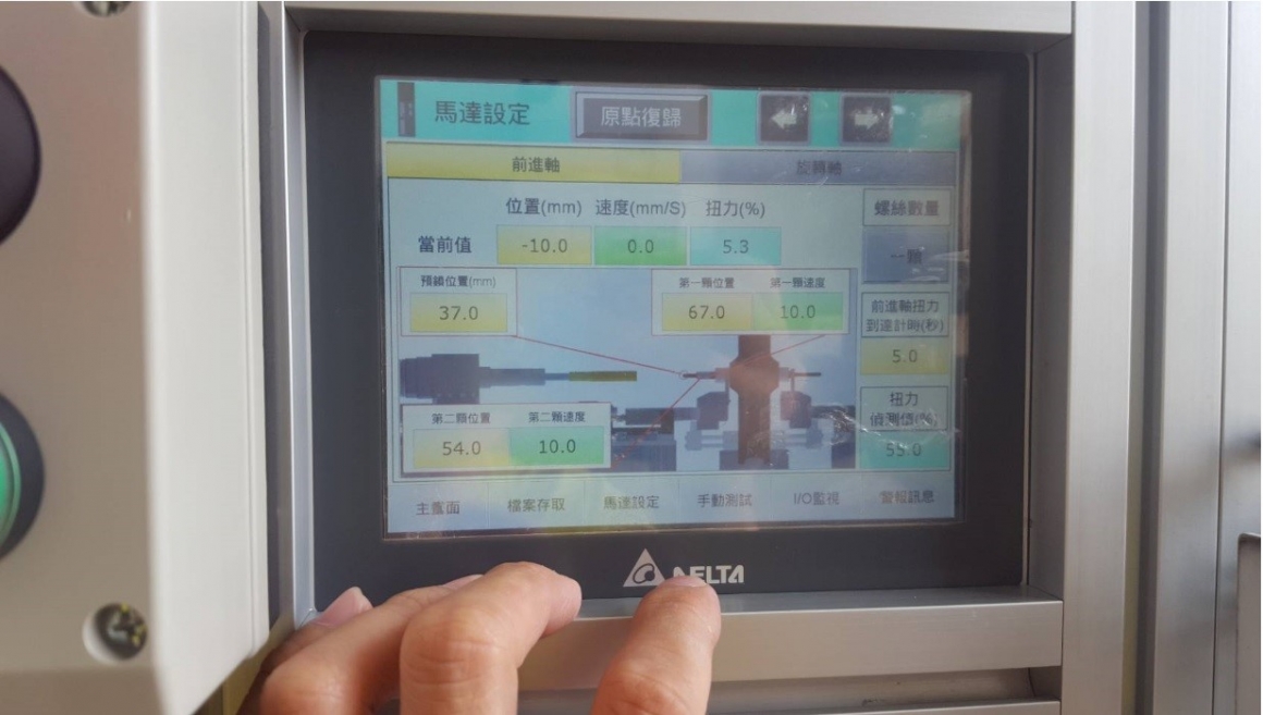 台达系列产品应用于锁螺丝机。该设备使用台达PLC控制台达伺服、人机,伺服左右轴是扭力模式速度限制和定位模式;伺服旋转轴是扭力模式速度限制,利用左右轴和旋转轴搭配来达到功能要求。