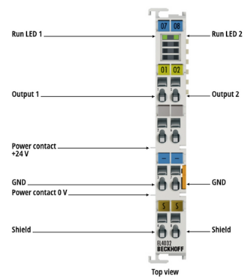 The EL4032 analog output terminal generates signals in the range between -10 and +10 V. The voltage is supplied to the process level with a resolution of 12 bits and is electrically isolated. The output channels of the EtherCAT Terminal have a common ground potential. The EL4032 combines two channels in one housing. The output stages are powered by the 24 V supply. The signal state of the EtherCAT Terminal is indicated by light emitting diodes.