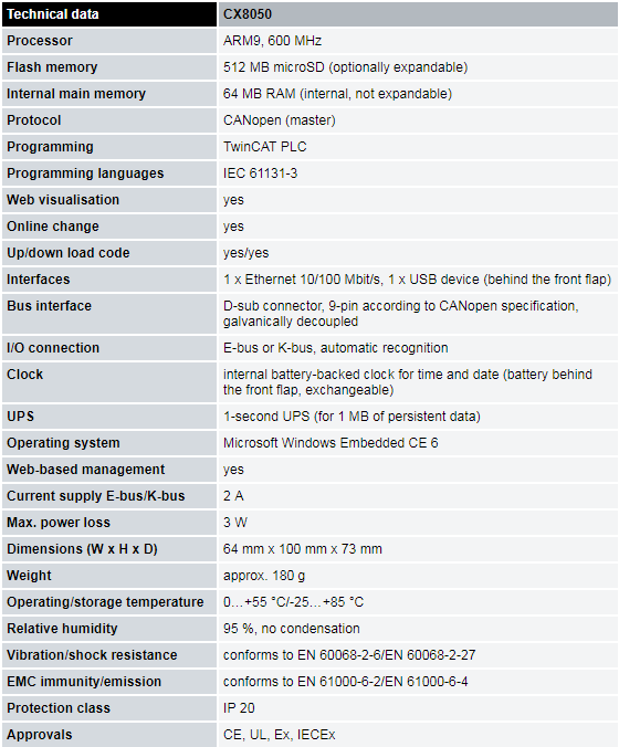 The CX8050 is a controller with a CANopen master interface. Apart from functioning as a CANopen master, it can also be used to support CAN-Layer-2 communication. Alternatively K-bus or E-bus terminals can be series-connected; the CX8050 automatically detects which system is connected during the start-up phase. The control system is programmed via the additional Ethernet interface.