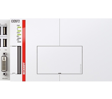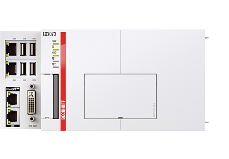 The CX2072 has an Intel® Xeon® CPU with a clock rate of 2.1 GHz (12 cores). A fan with ball bearings and speed monitoring is integrated into the basic CPU module. In addition to the CPU, the basic module also contains the main memory with a size of 8 GB RAM, optionally available with up to 32 GB. The controller boots from a CFast flash memory card where both the operating system as well as user programs and data are stored.
