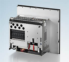 The CP65xx are equipped with Intel® Celeron®, Pentium® or Core™ i3/i5/i7 processors on an ATX motherboard and have PCI and PCI Express slots. A multi DVD drive can be installed. A 100 to 240 AC full range power supply or a 24 V DC power supply is used in the PC. The Control Panel is connected to the PC via DVI and USB. The PC deals with the power supply for the Control Panel. The cables are installed in the PC housing.