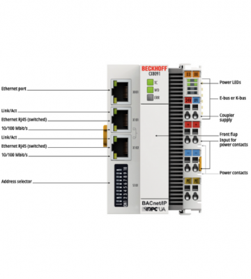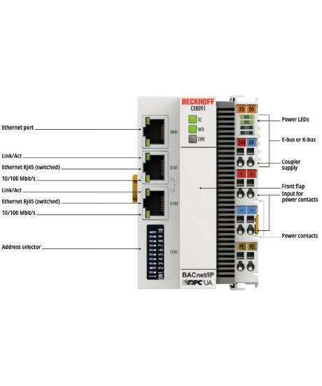 The CX8091 is a control system with a switched Ethernet port. It supports the BACnet and OPC UA protocols. K-bus or E-bus terminals can be attached as required; the CX8091 automatically recognises the type of I/O system connected during the start-up phase. The control system is programmed with TwinCAT 2 via the fieldbus interface or the additional Ethernet interface.