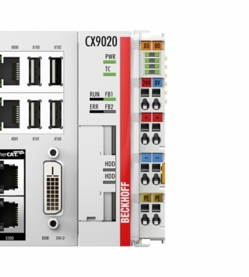 The CX9020 is a compact, DIN rail-mountable Ethernet control system with 1 GHz ARM Cortex™-A8 CPU. The connection for the Beckhoff I/O systems is directly integrated into the CPU module. The unit offers automatic bus system identification (K-bus or E-bus) and independently switches in the corresponding mode. The CX9020 comprises the CPU with two microSD card slots, the internal RAM and 128 kB NOVRAM as non-volatile memory. The basic configuration also includes two switched Ethernet RJ45 interfaces, four USB 2.0 interfaces and a DVI-D interface. The RJ45 interfaces are connected to an internal switch and offer a simple option for creating a line topology without the need for additional Ethernet switches. The operating system is Microsoft Windows Embedded Compact 7. TwinCAT automation software transforms a CX9020 system into a powerful PLC and Motion Control system that can be operated with or without visualisation. Optionally, the unit can be ordered with a fieldbus, serial or audio interface.