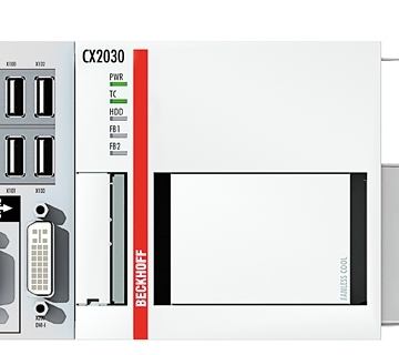 The unit can optionally be ordered with a fieldbus or serial interface. Other components from the CX2000 family can be connected via the multi-pin terminals on either side. The operating system is Microsoft Windows Embedded Compact 7 or Windows Embedded Standard 7 P. TwinCAT automation software transforms a CX2030 system into a powerful PLC and Motion Control system that can be operated with or without visualisation. Due to its high-performance the CX2030 can be used for interpolating 3-D path movements with TwinCAT NC I.
