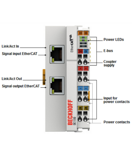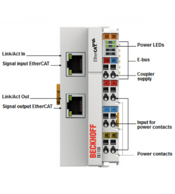 The EK1100 coupler connects EtherCAT with the EtherCAT Terminals (ELxxxx). One station consists of an EK1100 coupler, any number of EtherCAT Terminals and a bus end terminal. The coupler converts the passing telegrams from Ethernet 100BASE-TX to E-bus signal representation.