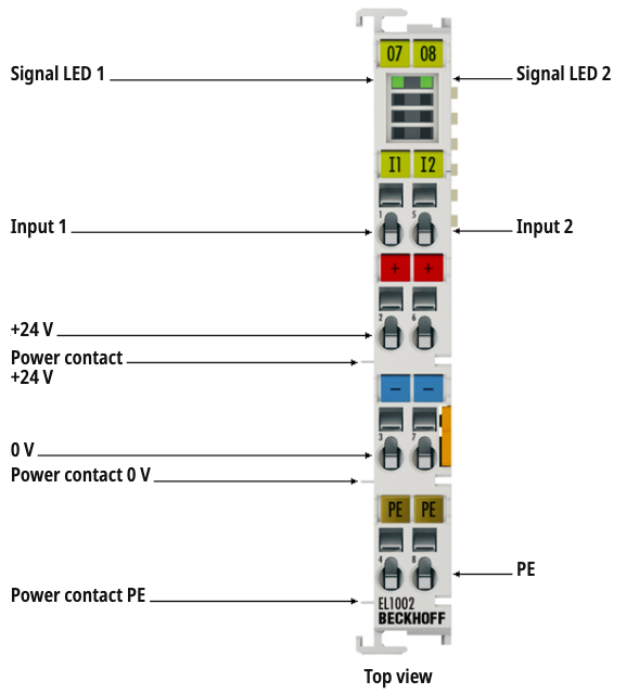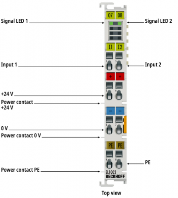 The EL1002 digital input terminal acquires the binary control signals from the process level and transmits them, in an electrically isolated form, to the higher-level automation unit. Digital input terminals from the EL100x series have a 3 ms input filter. The EtherCAT Terminals indicate their state via an LED.