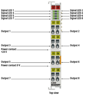 The EL2008 digital output terminal connects the binary control signals from the automation unit on to the actuators at the process level with electrical isolation. The EtherCAT Terminal indicates its signal state via an LED.