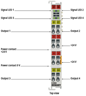 The EL2084 digital output terminal connects the binary control signals from the automation unit on to the actuators at the process level with electrical isolation. The EtherCAT Terminal has four 0 V (ground) switching outputs and generates load currents with outputs that are resistant to overload and short-circuit. It contains four channels that indicate their signal state by means of light emitting diodes.