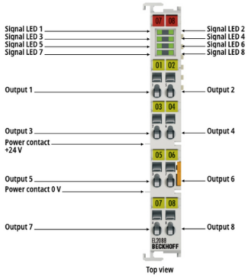 The EL2088 digital output terminal connects the binary control signals from the automation unit on to the actuators at the process level with electrical isolation. The EtherCAT Terminal has eight 0 V (ground) switching outputs and generates load currents with outputs that are resistant to overload and short-circuit. It contains eight channels that indicate their signal state by means of light emitting diodes.