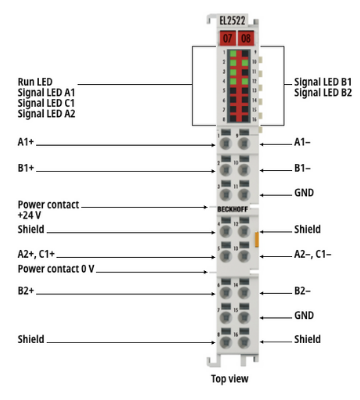 The EL2522 incremental encoder simulation terminal (pulse train) outputs a signal that is modulated via the frequency signal on two channels with four outputs. The signal can be used to control motor drivers or other signal receivers, which are controlled by single cycles. As with the EL2521, the pulse sequence and pulse number can be directly specified via the process data in the frequency. Alternatively, the integrated travel distance control can be used. For each channel the operating mode (frequency modulation, pulse/direction specification and incremental encoder simulation) can be selected. In addition, the EL2522 can control three output channels in the ABC encoder simulation.
