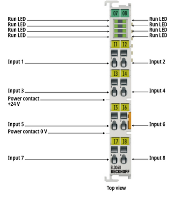 The EL3068 analog input terminal processes signals in the range between 0 and 10 V. The voltage is digitised with a resolution of 12 bits and is transmitted (electrically isolated) to the higher-level automation device. The EL3068 EtherCAT Terminal combines eight channels in one housing. The power contacts are connected through. The 0 V power contact is used as reference ground connection for the inputs. The signal state of the EtherCAT Terminal is indicated by light emitting diodes.