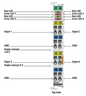 The EL3144 analog input terminal processes signals in the range between 0 and 20 mA. The current is digitised to a resolution of 16 bits and is transmitted (electrically isolated) to the higher-level automation device. The EL3144 EtherCAT Terminal features 2-wire conductors for the four single-ended inputs with a common internal ground potential. The power contacts are connected through. The signal state of the EtherCAT Terminal is indicated by light emitting diodes.
