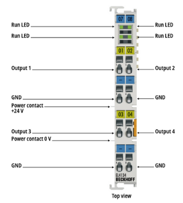 The EL4134 analog output terminal generates signals in the range between -10 and +10 V. The voltage is supplied to the process level with a resolution of 16 bits and is electrically isolated. The output channels of the EtherCAT Terminal have a common ground potential. The EL4134 has four channels. The signal state of the EtherCAT Terminal is indicated by light emitting diodes.