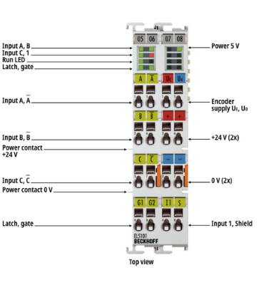 The EL5101 EtherCAT Terminal is an interface for the direct connection of incremental encoders with differential inputs (RS422). A 32/16 bit counter with a quadrature decoder and a 32/16 bit latch for the zero pulse can be read, set or enabled. Incremental encoders with alarm outputs can be connected at the interface’s status input. Interval measurement with a resolution of up to 100 ns is possible. The gate input allows the counter to be halted. The counter state is taken over with a rising edge at the latch input.