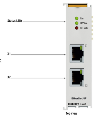 The EL6652 EtherNet/IP-Master Terminal has a switched 2-port Ethernet connection and can thus be operated in a line with further Ethernet/IP nodes. The process data are configured by an EtherCAT master, allowing different process data and different sizes. The EL6652 supports both multicast and unicast connections. Up to 16 simple EtherNet/IP-Slave devices can be connected via one generic node. The EL6652 is optionally also available as a slave version.