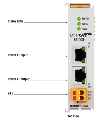 The EtherCAT bridge terminal EL6692 enables data exchange between EtherCAT strands with different masters. It also enables synchronisation of the distributed clocks of the individual strands. The power supply on the primary side (E-bus) comes from the E-bus, on the secondary side (RJ45) via an external connection. If several EL6692 are used, data traffic to the terminals on the other side can continue in the event of a power supply failure on one side. The bridge terminal can also be used for integrating a subordinate PC system as an EtherCAT slave.