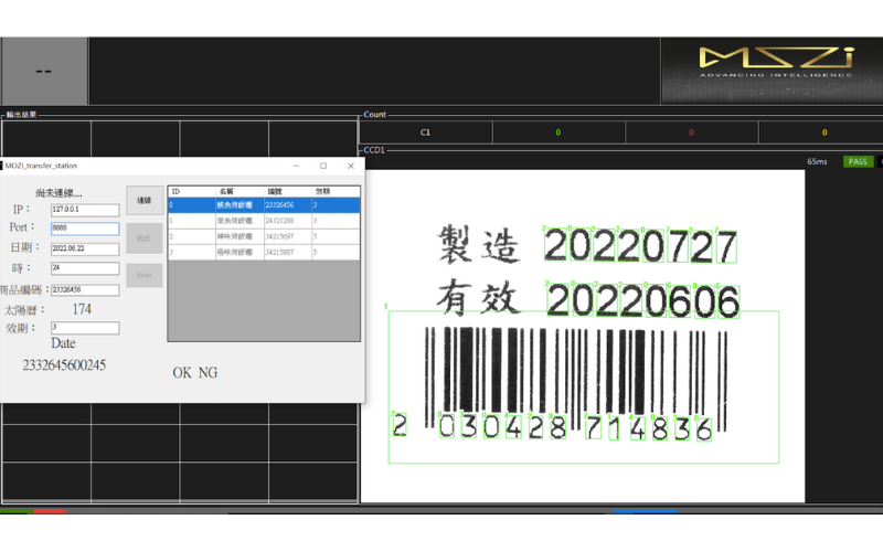 內容後,將相關資料傳送給標籤機,並搭配MOZI檢測後與原先數值驗證是否相等