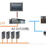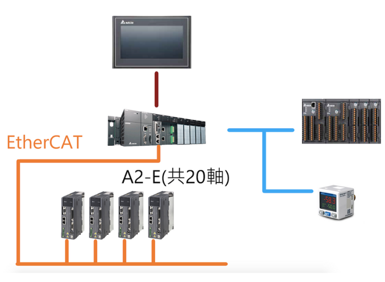 * 利用AH500系列搭配AH20EMC模組,台達EtherCAT伺服總線式控制方案控制20軸點對點運動,並搭擴充備板,實現IO點數1000點之需求。