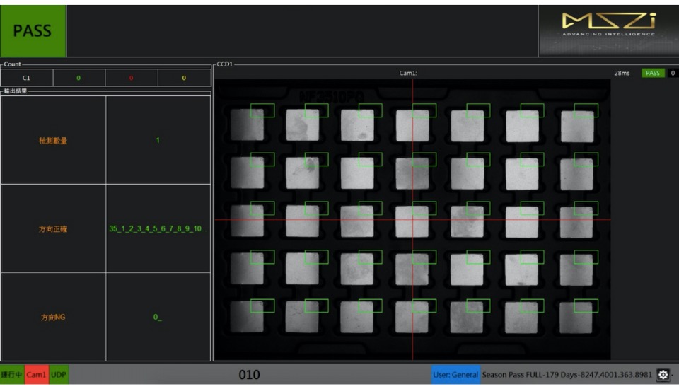 *陣列式圖形比對: 使用金屬工件上的特徵進行學習,並且可設置需要陣列大小,輕鬆的判斷整盤料件方向性是否一致。