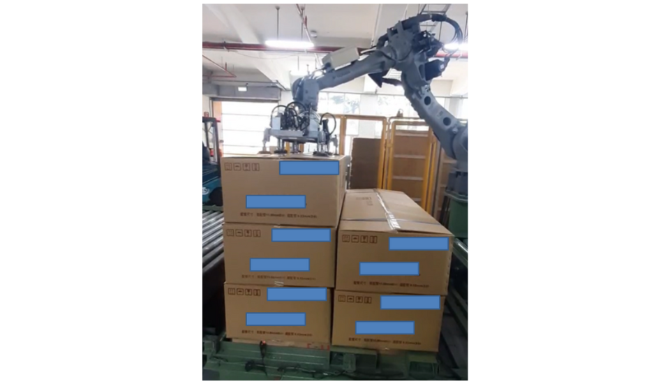 * 此設備搭配安川機械手臂,高自由度六軸XYZ三向軸UVW三向旋轉軸,可吸取30-40公斤之紙箱做堆疊,高度180CM處堆疊高度,減少產線空間,增加堆疊穩定度,減少人員搬運物料所造成勞工傷害。
