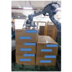 * 此案為應用安川六軸機械手臂配合松下PLC,客戶於松下人機設定相關紙箱尺寸,共有20種紙箱模式,手臂依紙箱尺寸,動作流程至入料區,開啟吸盤吸取紙箱,移至棧板做不同方式之堆疊,一層二個紙箱,堆疊五層,有直式的擺放與橫式擺放皆能達到,也能統一將外部標籤統一朝向入庫的方向。