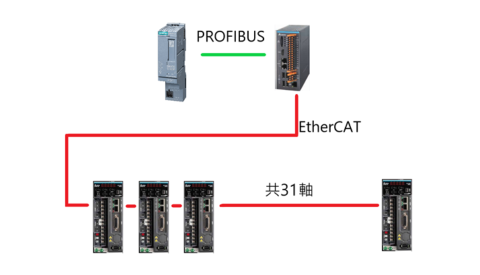 利用 AX8 PROFIBUS 通訊協議功能,與西門子 PLC 交握,控制 31 軸台達伺服,