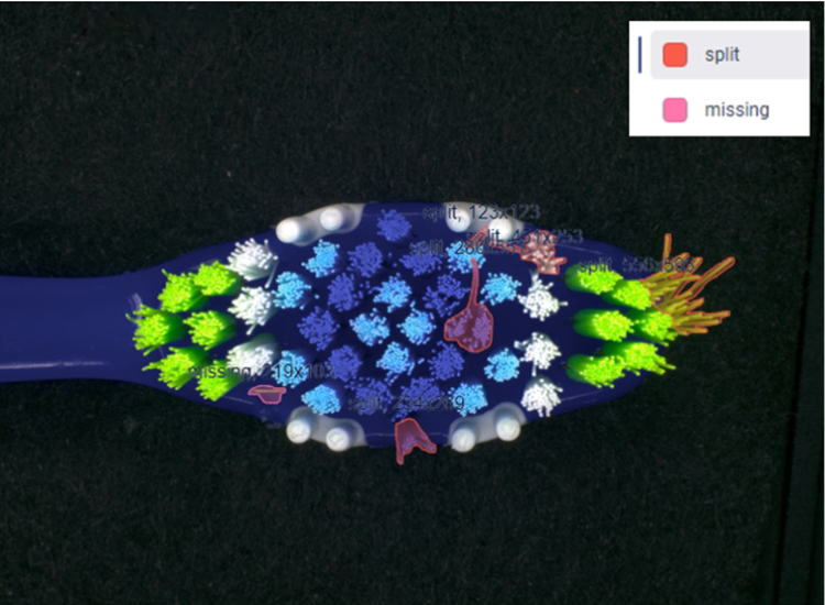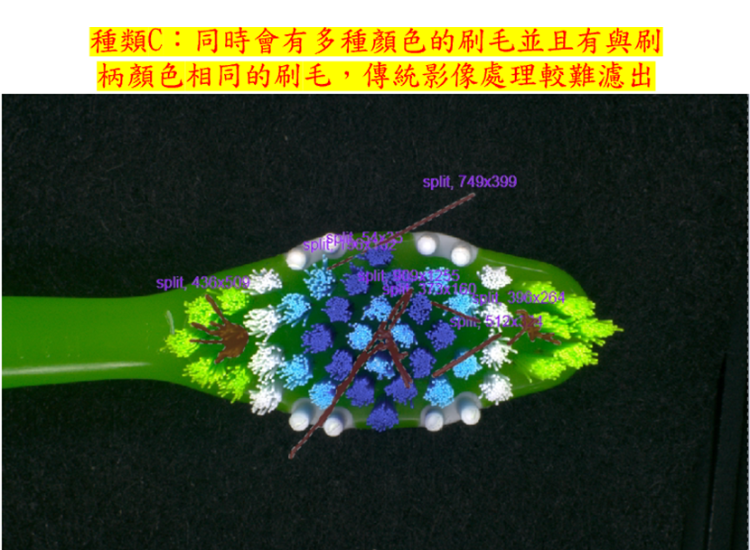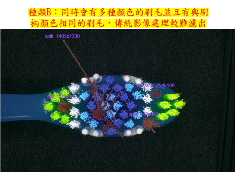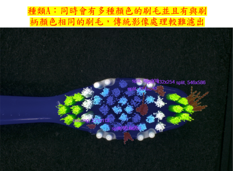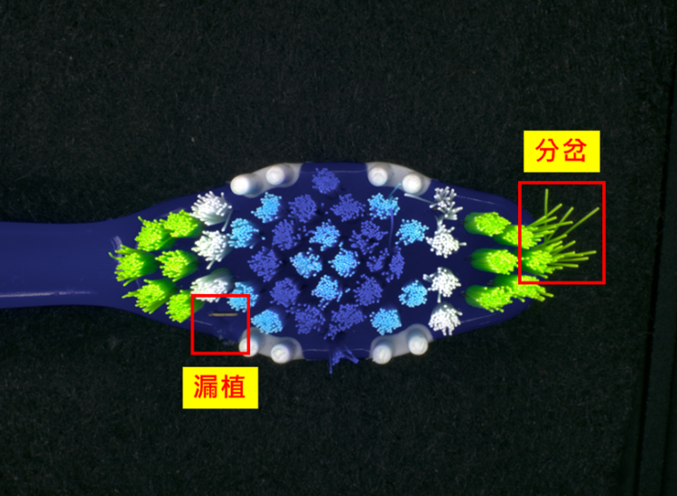 應用說明 -客戶需求:樣品多種顏色,檢測牙刷刷毛的漏植、少毛及分岔的位置