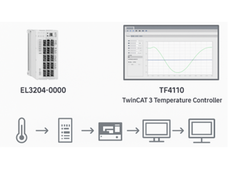 Beckhoff 提供的 EL3204 RTD 模組可直接量測 Pt100 / Pt1000 感測器輸出訊號,以高精度轉換為溫度值,再由 TF4110 溫控模組 於 PLC 中執行即時 PID 計算與控制。