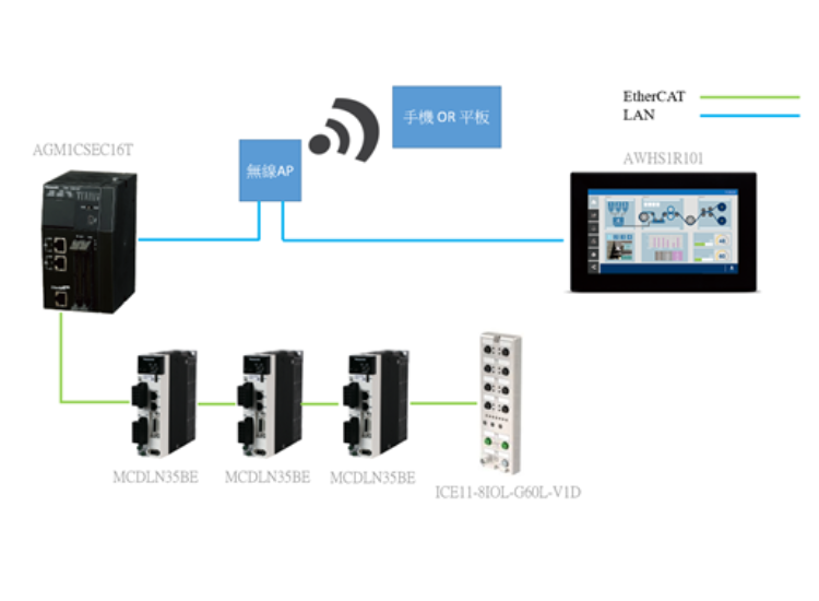 透過 GM1 的 EtherCAT 使動作跟連接的 RemoteIO 訊號同步增加穩定性,WH 人機能夠透過精簡的話面呈現讓場內人員在大量管理設備時擷取關鍵資訊,可以使廠內管理更加輕鬆。